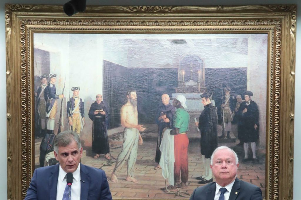 Os deputados Leur Lomanto e Paulo Azi em frente a reprodução do quadro “Tiradentes ante o carrasco”, de Rafael Falco, em sessão da CCJ nesta quarta (22) / Crédito: Bruno Spada/Câmara dos Deputados