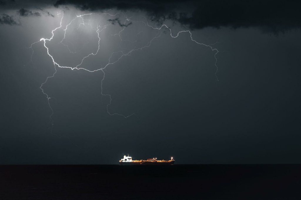 Raio sobre um navio carregando combustíveis em Omã, próximo ao estreio de Ormuz | Crédito: Elke Scholiers/Getty Images