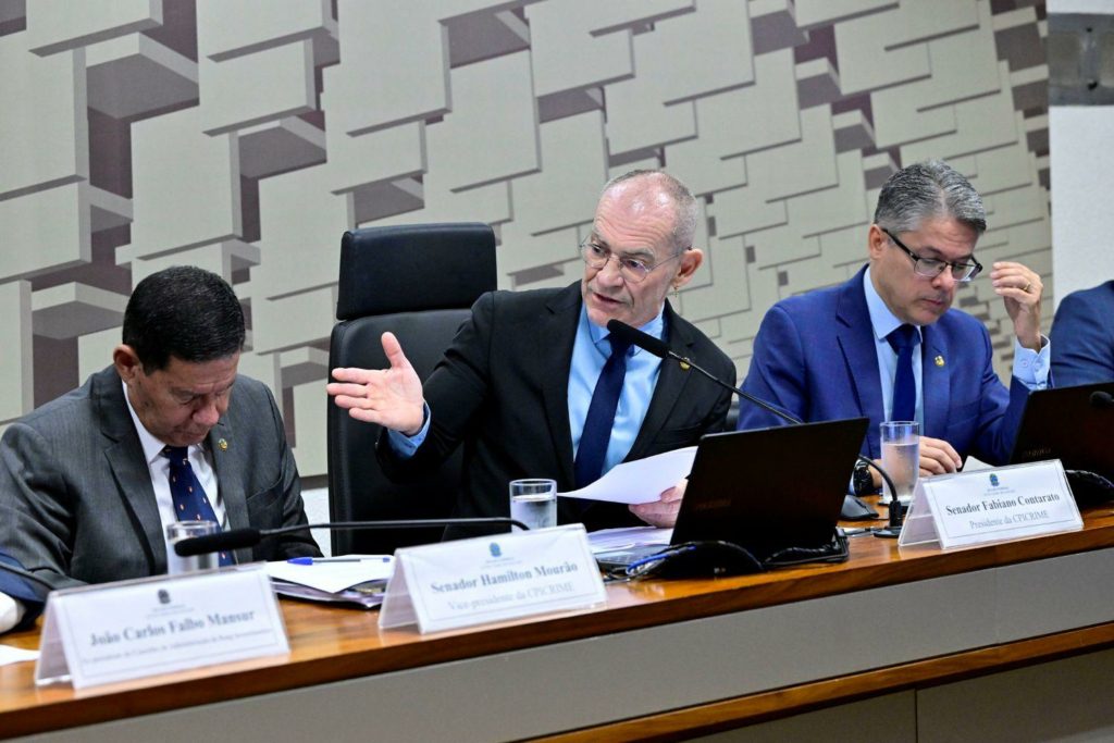 Os senadores Hamilton Mourão, Fabiano Contarato e Alessandro Vieira em sessão da CPI do Crime Organizado / Crédito: Geraldo Magela/Agência Senado