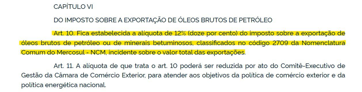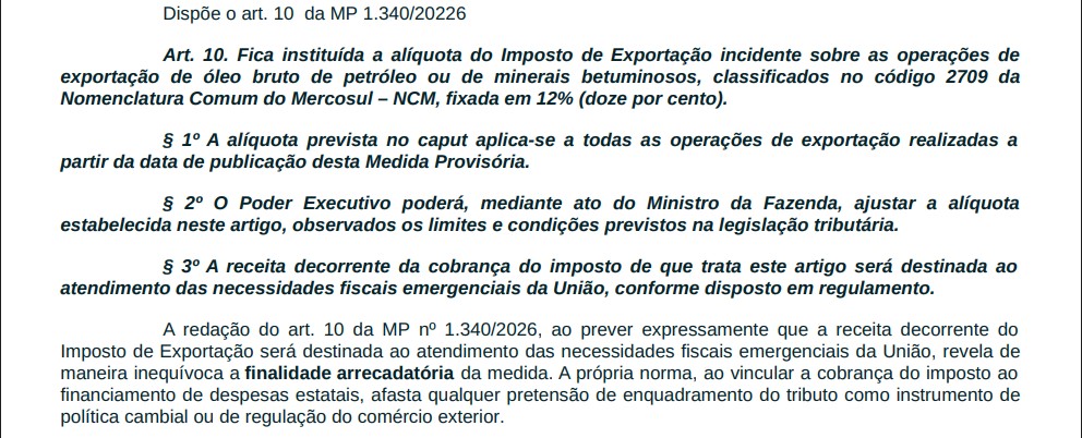 Os parágrafos citados pelo juiz, porém, não constam no Diário Oficial da União (DOU) de 12 de março de 2026. O texto publicado no DOU diz somente que “fica estabelecida a alíquota de 12% (doze por cento) do imposto sobre a exportação de óleos brutos de petróleo ou de minerais betuminosos, classificados no código 2709 da Nomenclatura Comum do Mercosul – NCM, incidente sobre o valor total das exportações”.