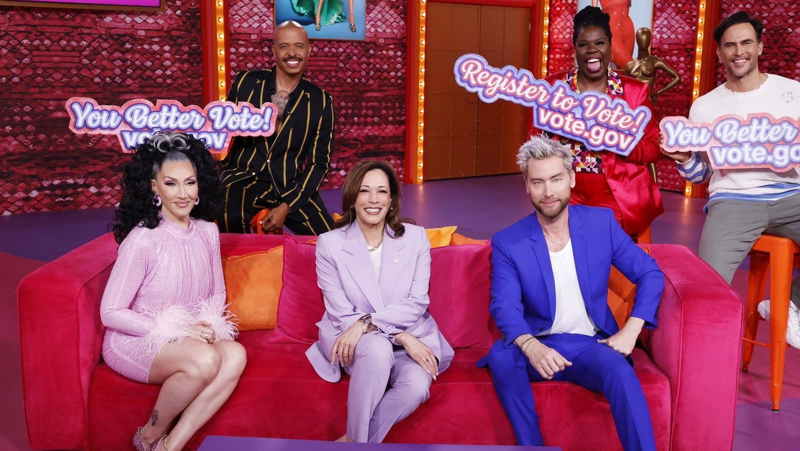 Harris encerrou sua mensagem incentivando os espectadores a se registrarem para votar e aplaudindo o hino de RuPaul, “A Little Bit of Love”.
