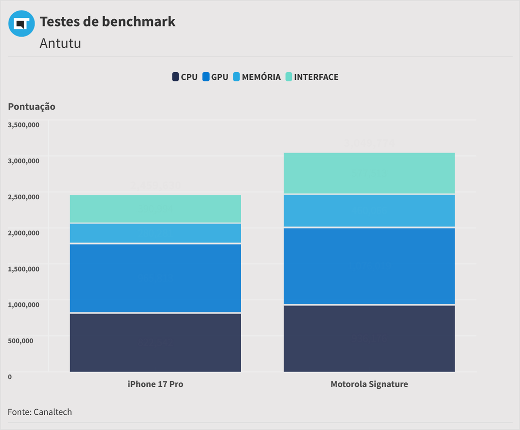 O iPhone 17 Pro é equipado com o chip A19 Pro, feito pela própria Apple, enquanto o Motorola Signature traz o Snapdragon 8 Gen 5 da Qualcomm. No dia a dia, ambos se saem muito bem, e aguentam bem praticamente qualquer tarefa.