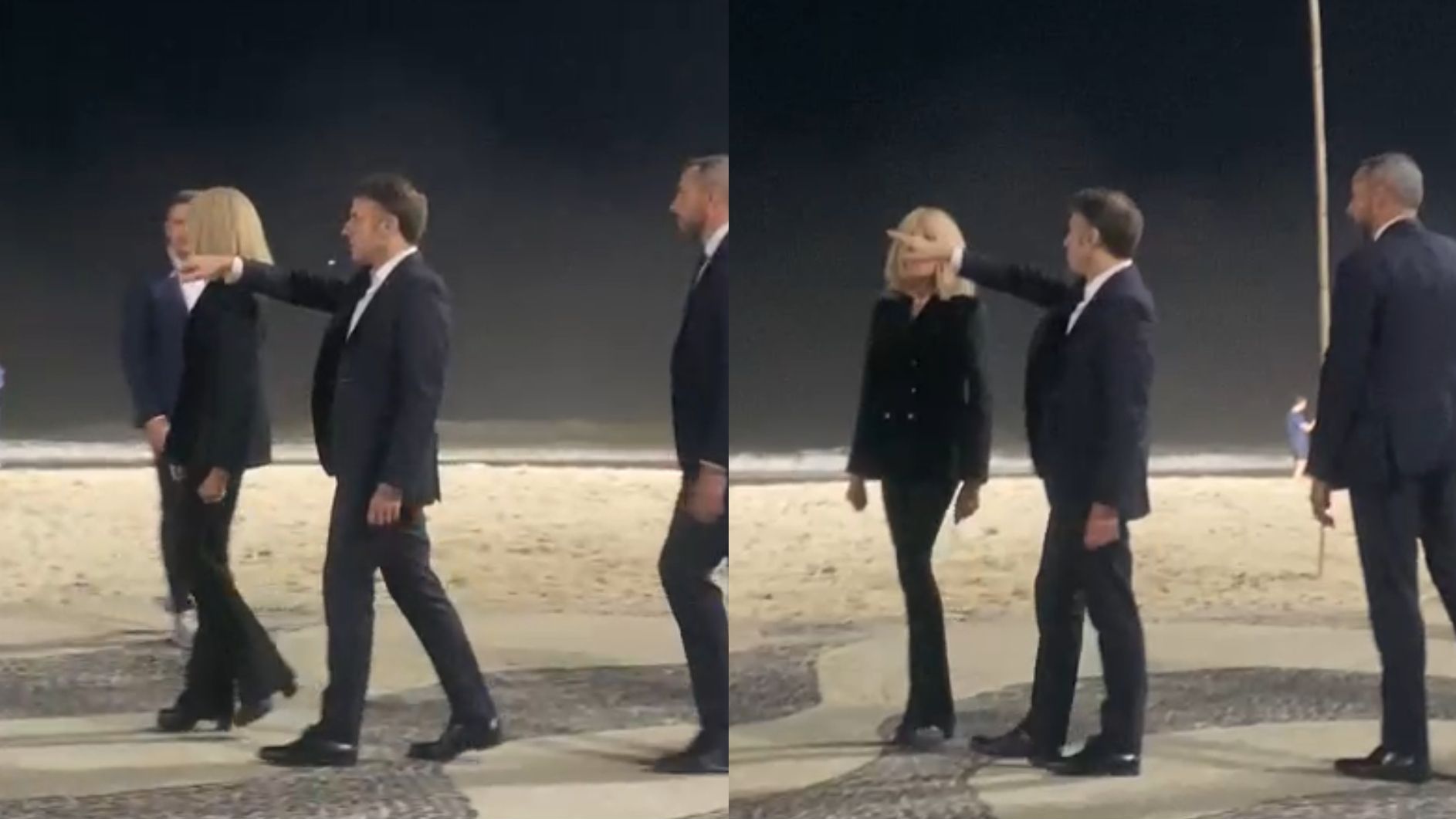 De terno, o líder francês caminhou pelo calçadão da praia ao lado da esposa, Brigitte Macron, por volta das 23h (horário de Brasília), registrou a angústia da CNN Débora Bergamasco.