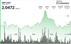 - O XRP foi negociado dentro de uma faixa de US$ 0,0563 (2,8%), movendo-se entre US$ 2,02 e US$ 2,07 antes de fechar perto de US$ 2,032.