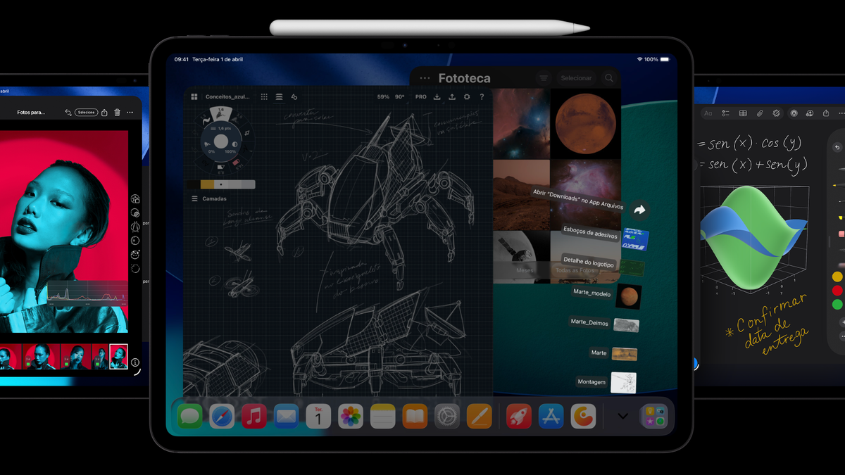 O iPadOS 26 também estreia junto com o novo hardware, trazendo um sistema de janelas redesenhado, novo app de Preview para PDFs e integração total com o Apple Intelligence — o pacote de IA que vai desde transcrição de chamadas até geração de imagens no Image Playground.