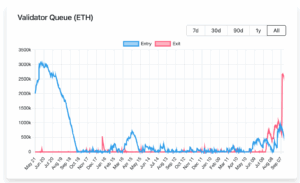 O sistema de prova de participação da Ethereum está enfrentando seu maior teste ainda. Em meados de setembro, aproximadamente 2,5 milhões de ETH-avaliados em aproximadamente US $ 11,25 bilhões-está esperando para deixar o validador definido, de acordo com painéis de fila do validador.