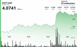 O ponto de Polkadot explodiu 6% maior nas últimas 24 horas, subindo de US $ 3,88 para US $ 4,11 em volume maciço, de acordo com o modelo de análise técnica da Coindesk Research.