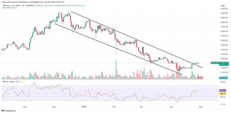O preço do Ethereum está pairando dentro de uma perspectiva de baixa, à medida que o token ETH caiu abaixo do nível de US $ 1.500 no início de abril. No entanto, em meio à melhoria das condições macroeconômicas, o movimento do preço do Ethereum recuperou uma perspectiva de alta, depois de sair de um canal descendente.