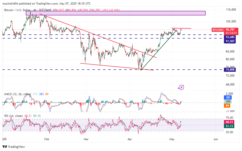 No entanto, um fechamento consistente acima de US $ 97 mil nos próximos dias definirá o tom para uma manifestação para o alto de todos os tempos acima de US $ 100 mil.