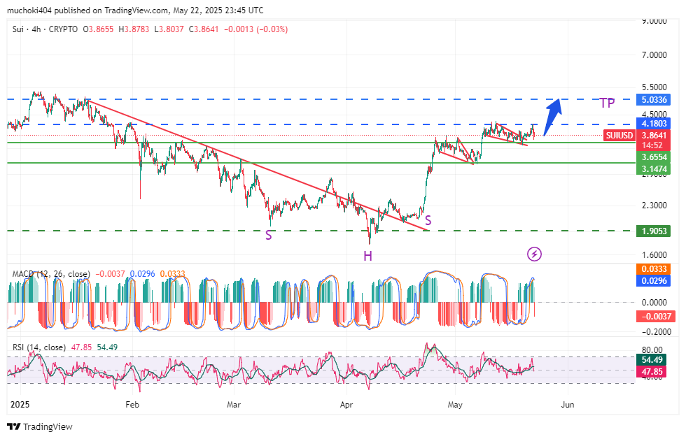A SUI Price vem formando um sentimento macro de alta após a rebote do mercado de criptografia mais ampla experimentada desde abril. No período de quatro horas, o preço da SUI foi rejeitado no nível de resistência em torno de US $ 4,18, sinalizando potencial correção de curto prazo em relação a US $ 3,6.