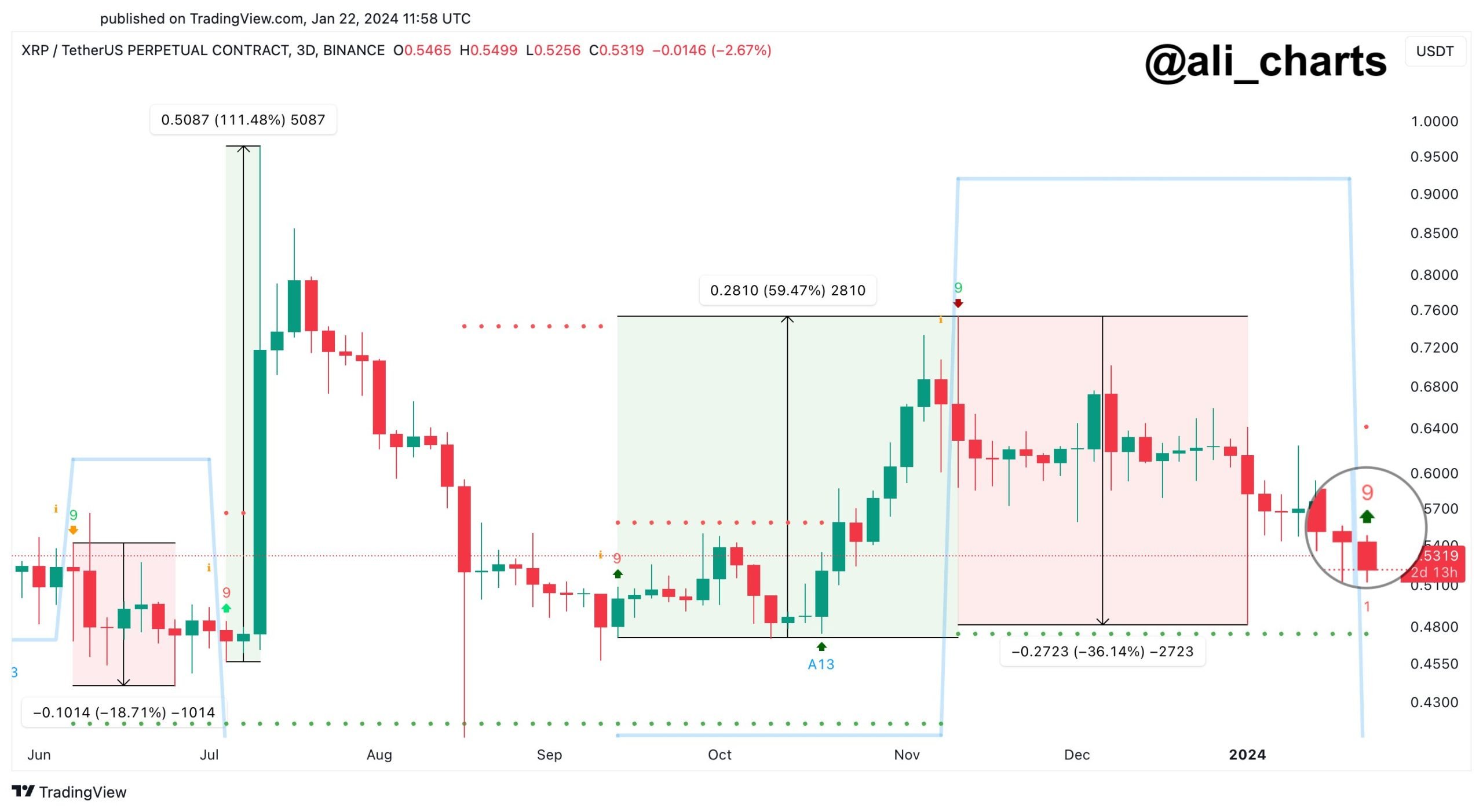 O XRP encerrou recentemente o antigo tipo de fase do TD Sequencial em seu preço de 3 dias, como mostra o gráfico compartilhado pelo analista abaixo: