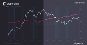 A Hash Ribbon sinaliza historicamente o fim da fase de capitulação do minerador quando a média móvel de 30 dias (MA) da taxa de hash ultrapassa a MA de 60 dias, transformando-se de vermelho claro em vermelho escuro no gráfico abaixo. Essa métrica, juntamente com uma mudança no momento do preço de negativo para positivo, indicou historicamente oportunidades de compra promissoras, representadas pela transição do vermelho escuro para o branco.