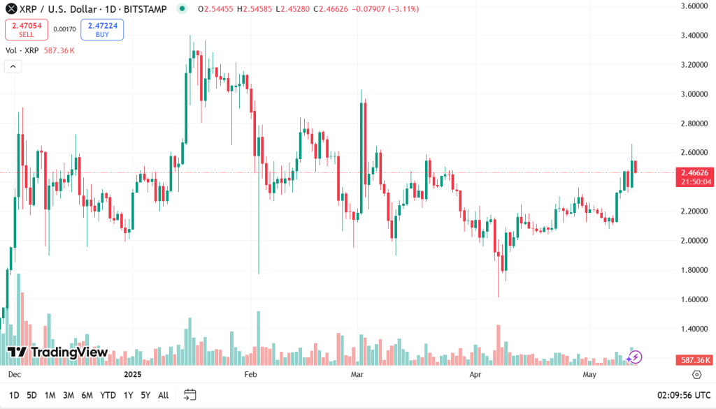 No gráfico diário, o XRP está tentando quebrar acima de um nível de resistência -chave em torno de US $ 2,45 a US $ 2,46. No entanto, para confirmar uma fuga, ele precisa fechar uma vela diária acima dessa linha. Se conseguir e conseguir atravessar mais de US $ 2,58 a US $ 2,59, pode significar uma grande tendência de alta.