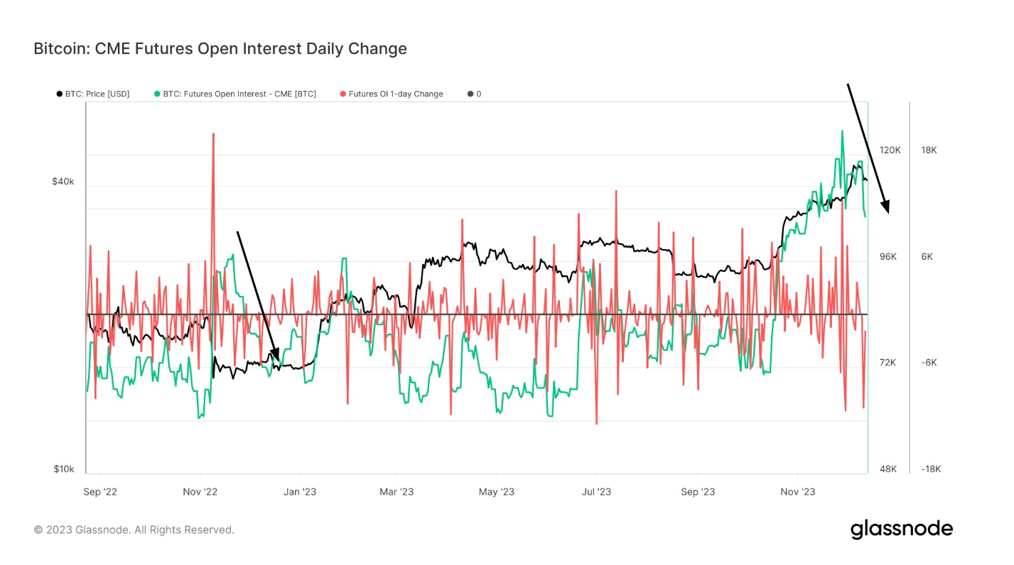 No entanto, essa mudança foi marcada pelo fechamento de aproximadamente 20.000 contratos de Bitcoin pela CME desde 28 de novembro. Em uma recessão notável, 11 de dezembro registrou uma das quedas mais significativas de um dia nos juros em aberto de futuros, com 10.500 contratos de Bitcoin fechados. Esta tendência não é inédita, uma vez que os períodos de final de ano testemunham frequentemente a renovação dos contratos. Com as empresas relutantes em manter uma exposição significativa durante o período de férias, tal tendência poderia ser considerada uma medida estratégica de redução do risco.