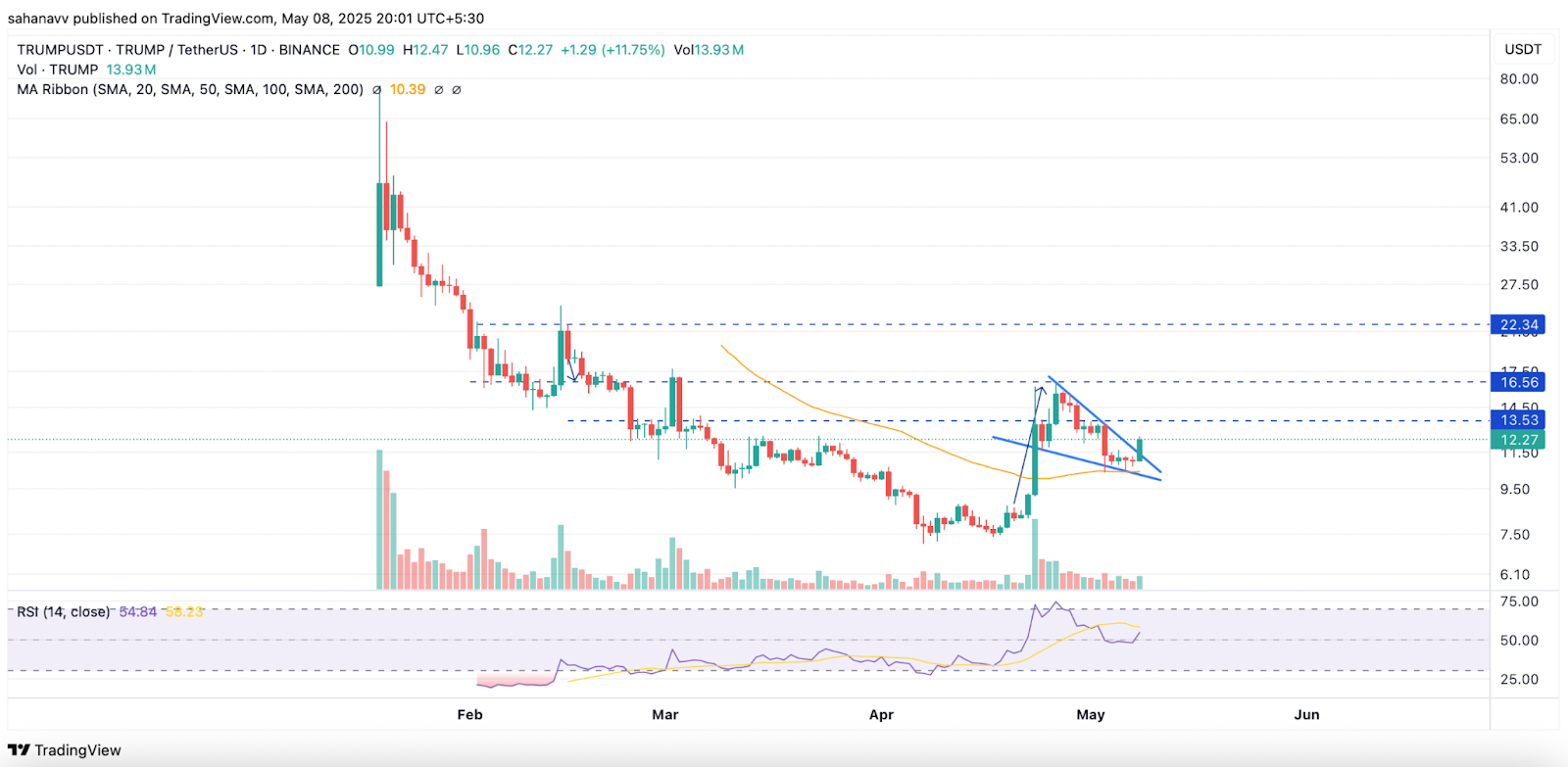 Trump oficial recebeu muita atenção desde que o lançamento foi anunciado pelo presidente dos EUA. Logo após o lançamento, o preço caiu quando a equipe de Trump vendeu suas participações, ganhando milhões de lucro. No entanto, o preço começou a subir e se rompeu com a faixa de baixa, indicando uma mudança na dinâmica do mercado.