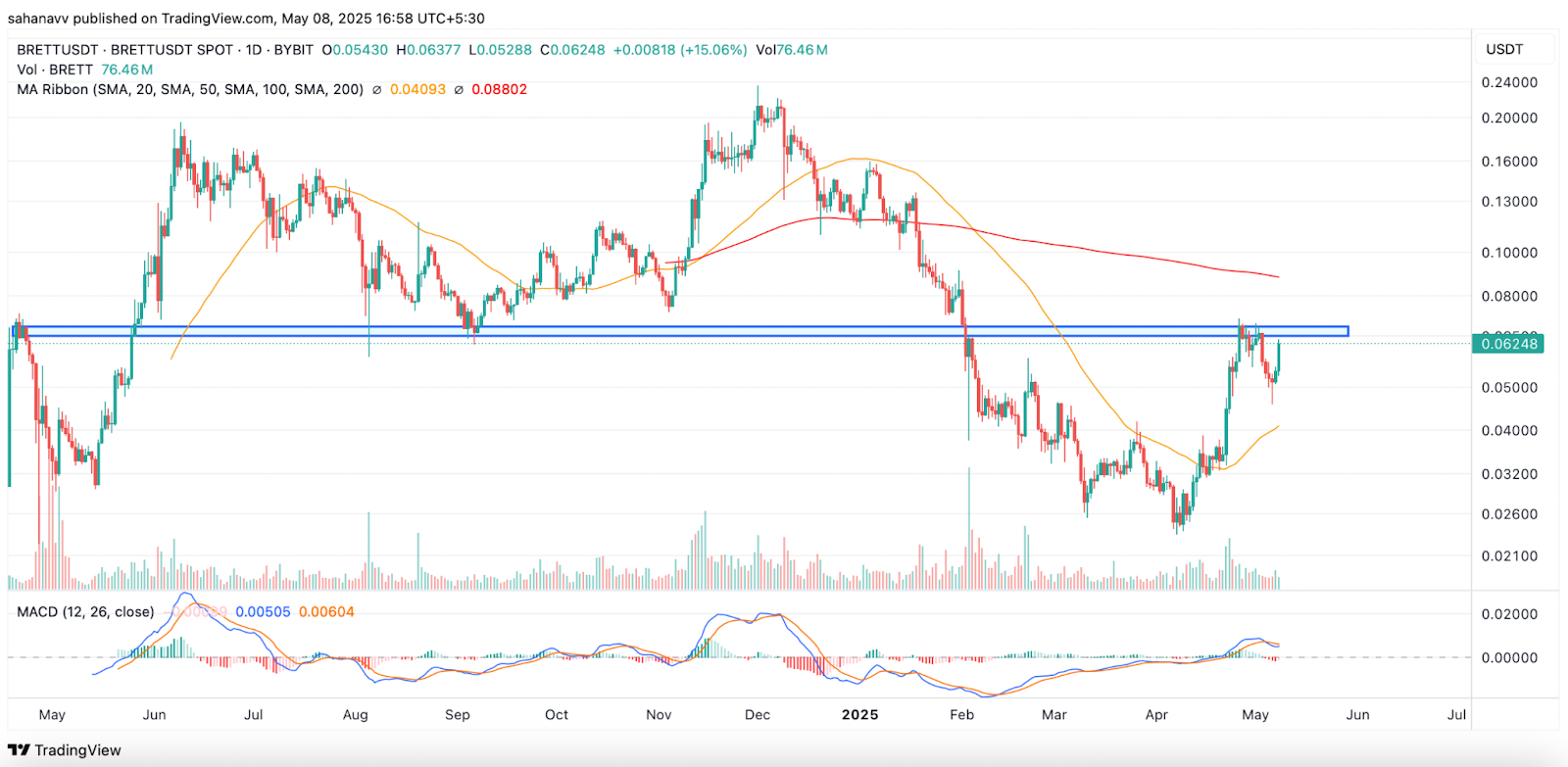 Brett Price está em ascensão, com a intenção de recuperar o valor de mercado de US $ 1 bilhão, pois o volume quase dobrou nos últimos dias. Com isso, o preço de Brett desencadeou um salto forte, o que ajudou o token a subir e testar uma zona de resistência importante. Esse nível tem atuado como um forte apoio no passado recente e, portanto, se recuperar esse suporte, o preço deverá retirar um zero de seu valor.