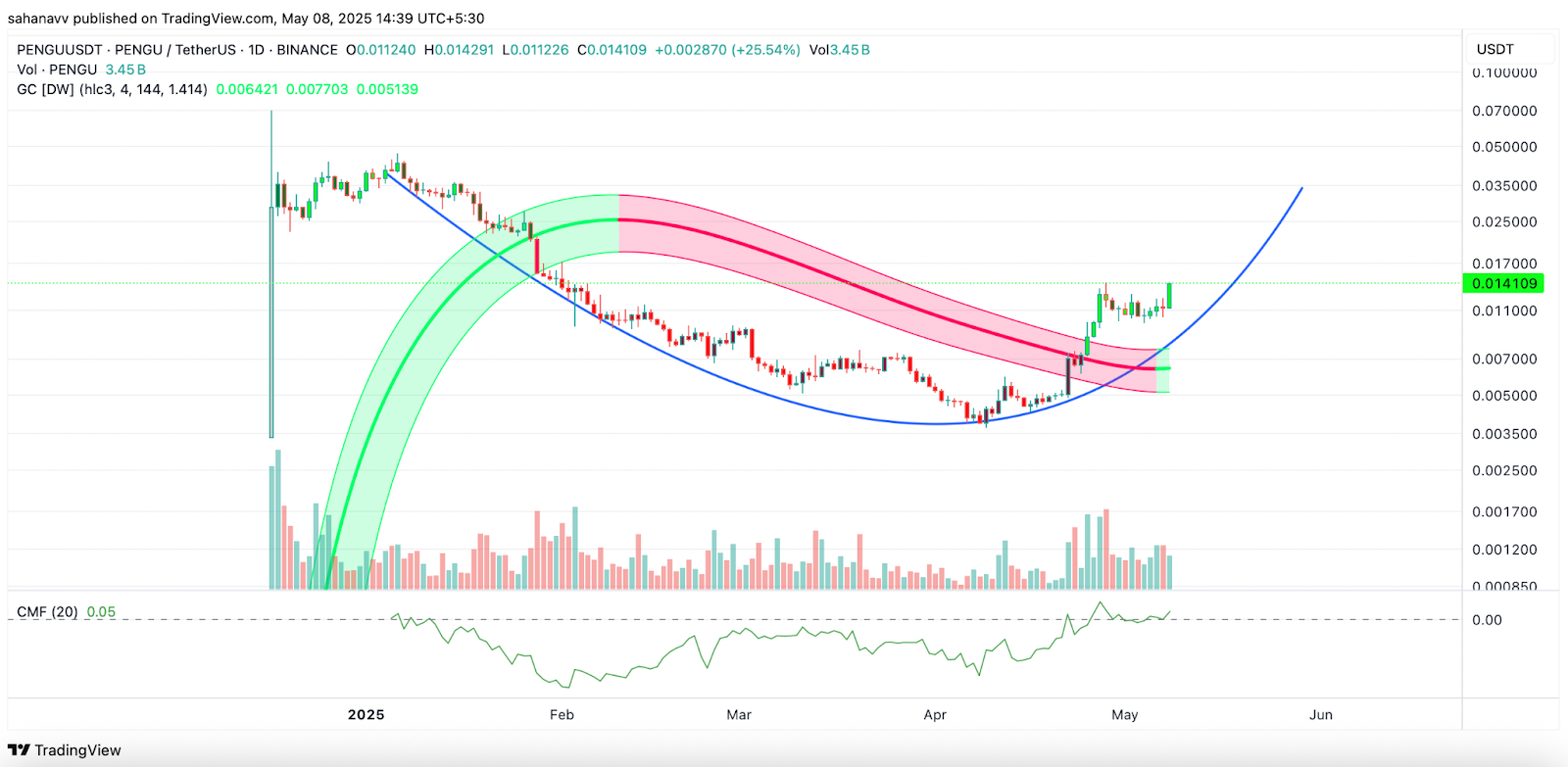 Como visto no gráfico acima, o preço do Pengu está seguindo uma curva de recuperação parabólica e se intensificou desde a última semana de abril. O canal gaussiano ficou otimista pela primeira vez desde fevereiro, e o CMF exibiu uma divergência de alta, sugerindo um aumento no fluxo de dinheiro na plataforma. Por outro lado, o MACD permanece dentro da faixa positiva, mostrando um aumento na pressão de compra. Portanto, o preço do Pengu deve permanecer dentro da curva e atingir o decote próximo a US $ 0,042.