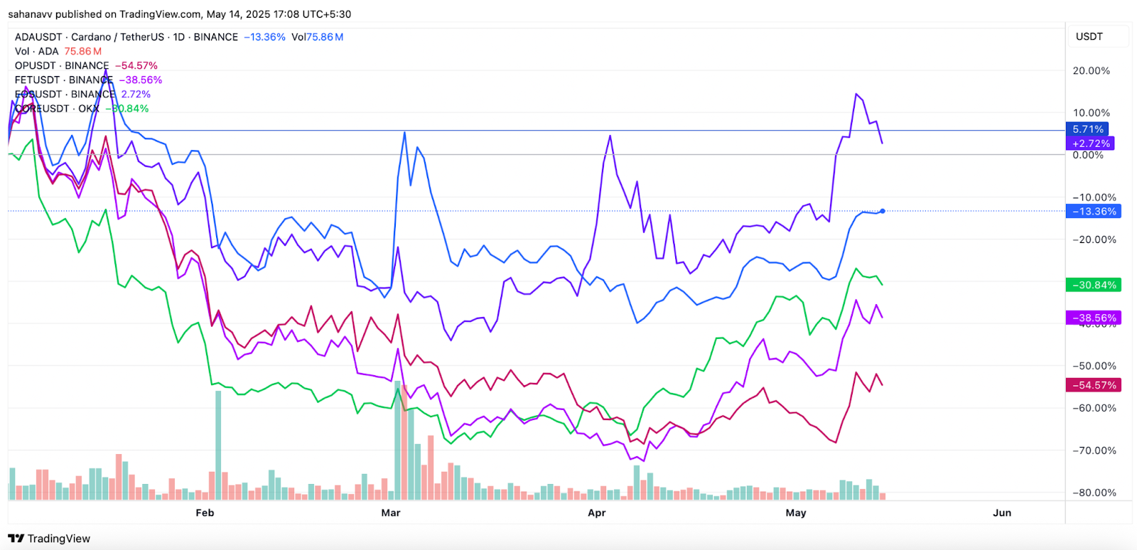 As pilhas (STX) estão sendo negociadas logo abaixo de US $ 1, enquanto otimismo (OP), Aliança de Superintelligência Artificial (FET), EOS (EOS), Core (Core) e Cardano (ADA) estão sendo negociados entre US $ 0,8 e US $ 0,9. Enquanto o otimismo lidera a corrida com mais de 40% de ganhos semanais, o preço do FET também aumentou mais de 22%. Embora o preço do Cardano (ADA) também tenha atraído quase 20% de ganhos nos últimos sete dias, o token pode continuar lutando para atingir US $ 1. Aqui está o porquê!