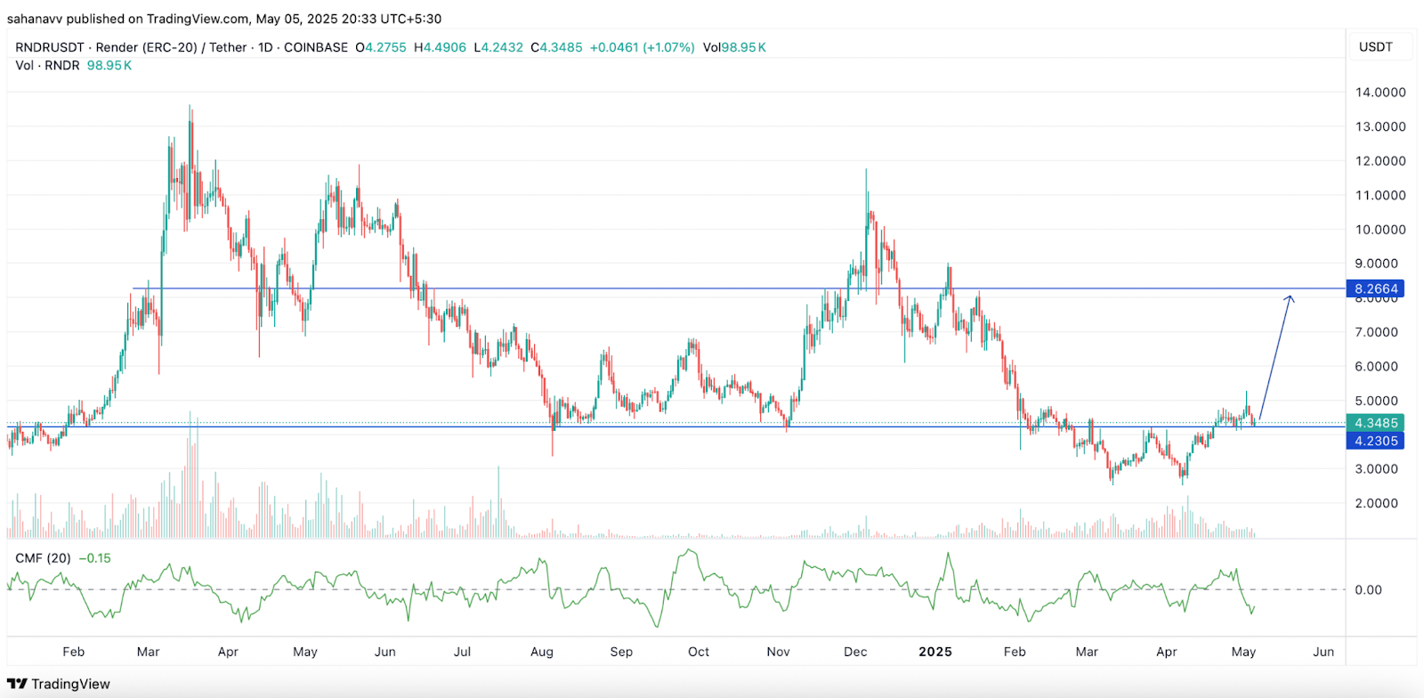 O recente rebote aumentou o preço acima do apoio crucial, que tem mantido o Renderize preço Desde o início de 2024. Além disso, o CMF desencadeou uma forte recuperação dos baixos locais em -0,2, sugerindo um aumento no fluxo de dinheiro. Portanto, acredita -se que o preço de renderização desencadeia um rebote e níveis seguros acima de US $ 6. Uma vez feito, um aumento acima de US $ 8,25 pode ser iminente, o que pode aumentar ainda mais o preço acima de US $ 10.
