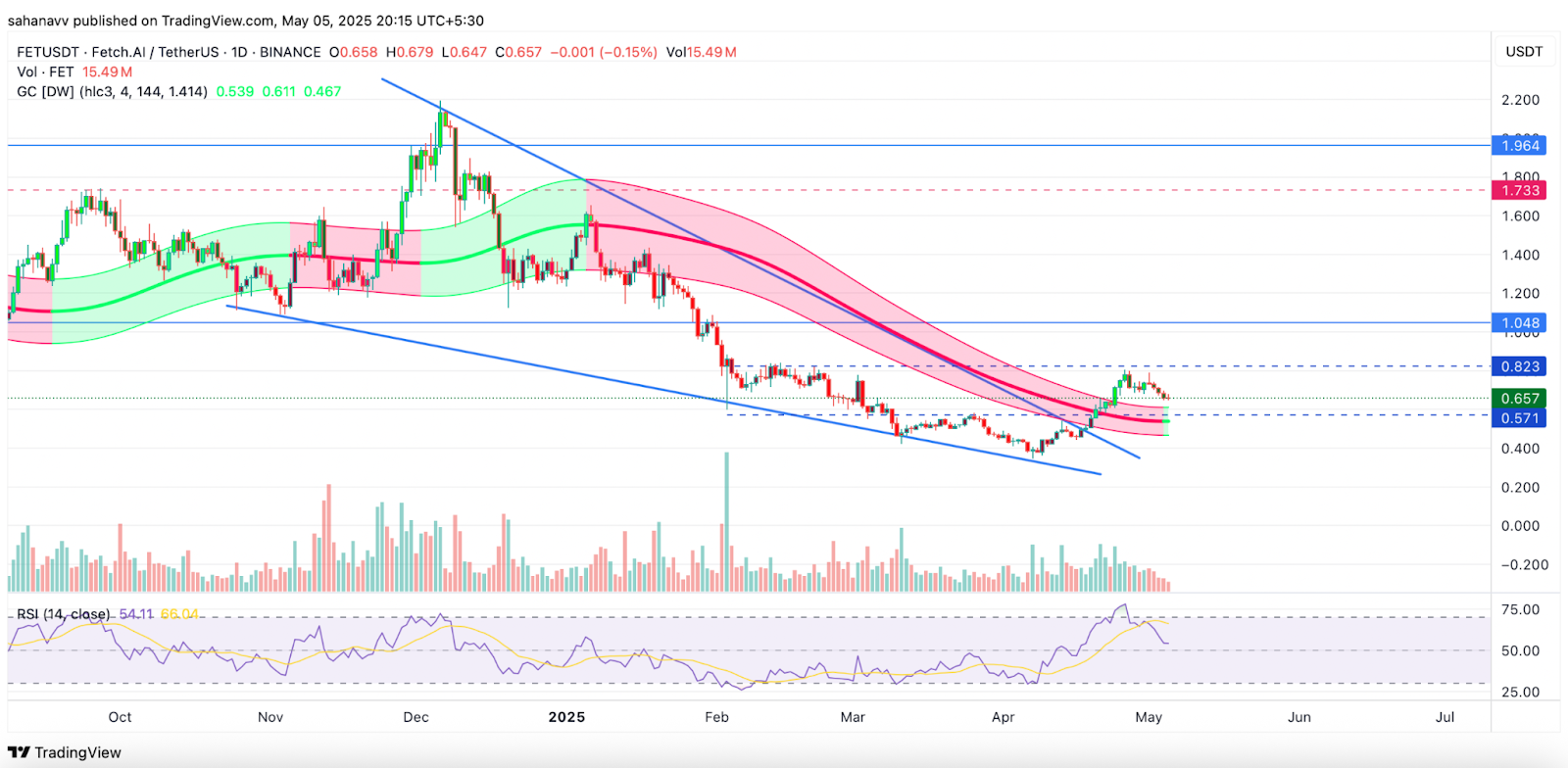 O preço do FET conseguiu quebrar a estrutura formada e está atualmente passando por uma correção. O token está se aproximando de uma zona de suporte horizontal chave no período mais baixo, que tem atuado como uma base sólida no passado recente. Embora o preço esteja enfrentando alguma pressão de baixa, um rebote do padrão de baixa pode desencadear uma forte subida de volta aos máximos locais.