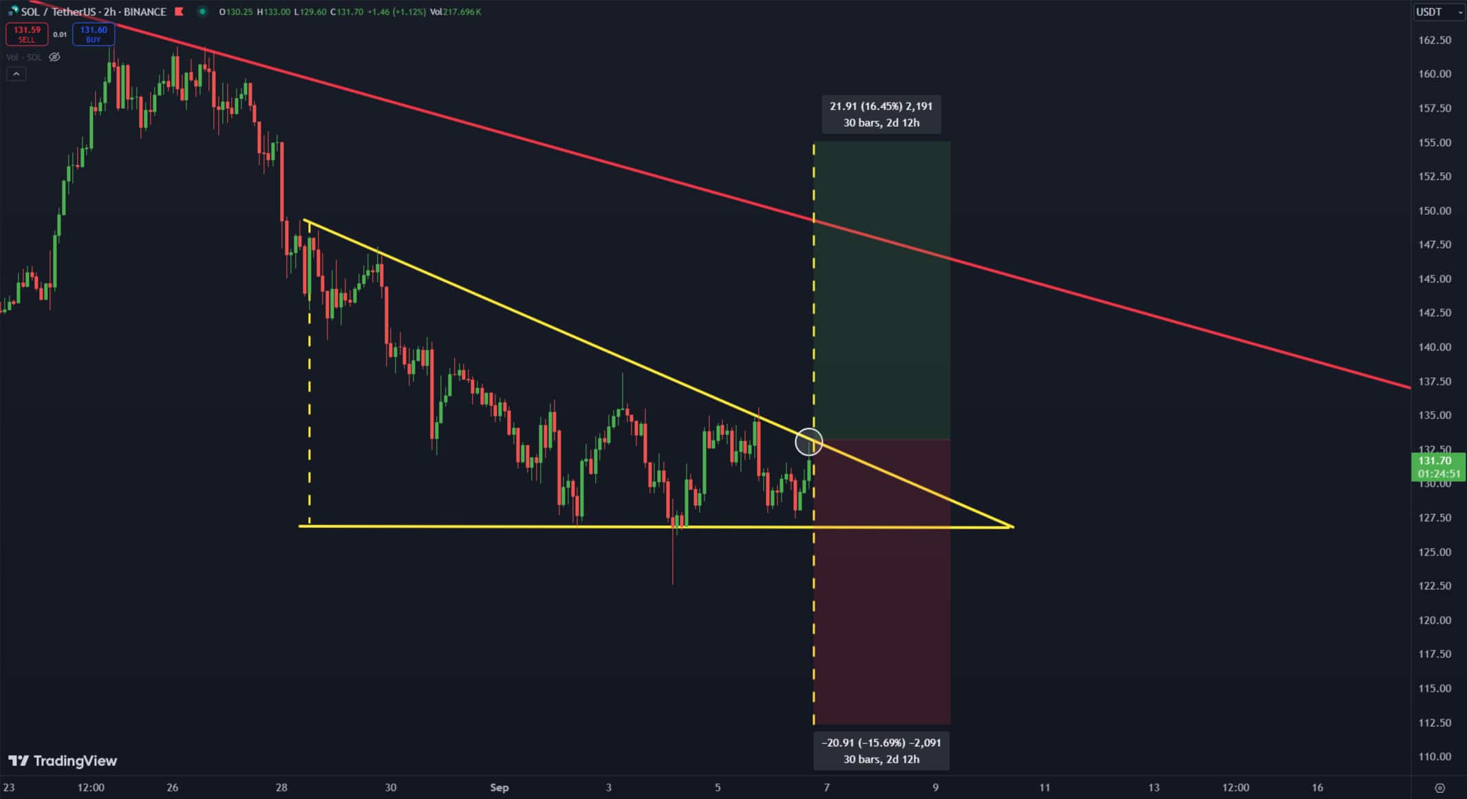 De acordo com Carl Runefeltum proeminente analista de mercado, a SOL está em uma conjuntura vital agora e pode subir ou cair nos próximos dias. De acordo com sua análise, Solana agora está sendo negociada dentro de um triângulo descendente, um padrão que pode ter resultados de alta ou baixa dependendo de sua formação.
