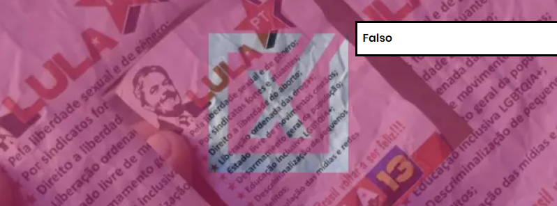 Na publicação agora investigada, o Boatos.org eo Metrópoles desmentiram a lista apresentada como projeto de governo de Lula No folheto é possível conferir uma foto não utilizada na campanha do candidato e estrela de materiais antigos do partido. Também não há registro de gráfico, CNPJ da federação ou tiragem no papel, conforme exibido no portal Metrópoles.