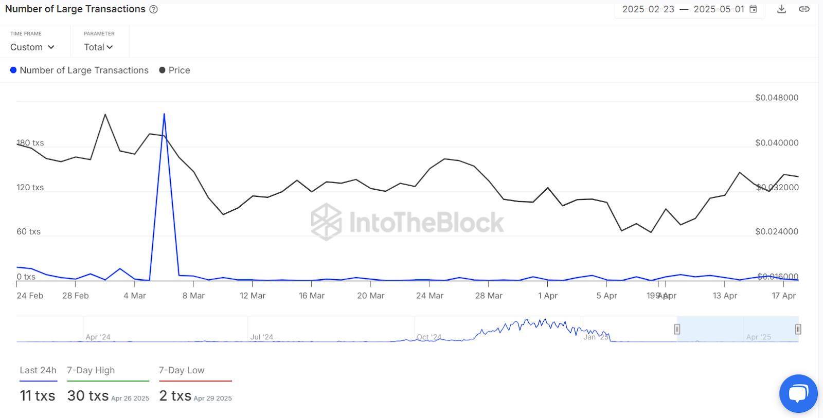 O gráfico de Bloco Intethe 180 TXs em 6 de março– Indicar atividade significativa da baleia, possivelmente acumulação ou distribuição. Pós-pico, grandes transações caíram acentuadamente, média 2–11 TXs por diamesmo quando o preço de Brett se recuperou de um baixo próximo a US $ 0,024 no início de abril para perto US $ 0,032 até 30 de abril.