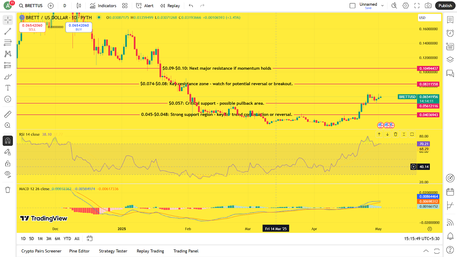 Se o RSI atingir a mesma zona novamente, os comerciantes devem esperar um teste da resistência de US $ 0,074 a US $ 0,082, com uma extensão potencial para US $ 0,09 a US $ 0,10 se o momento se fortalecer. Um esforço para US $ 0,10 a US $ 0,11, o preço estimado necessário para Brett recuperar um valor de mercado de US $ 1 bilhão, marcaria um marco psicológico e técnico.