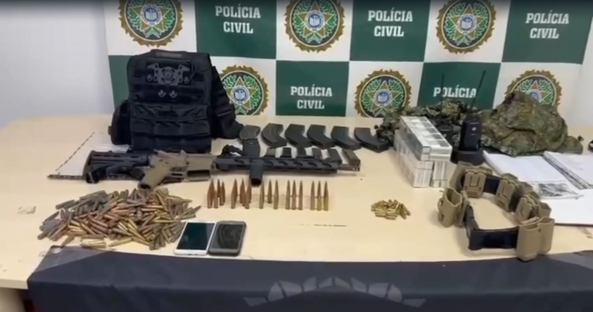 Durante a ação, os policiais ainda apreenderam um fuzil AK-47, uma grande quantidade de munição e materiais típicos de atividades milicianas em uma residência próxima ao local da prisão.