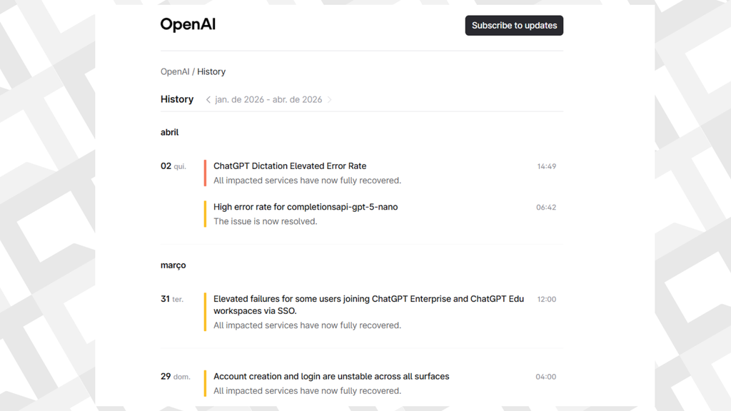 Uma instabilidade pode acontecer de diferentes formas e nem sempre afetar todas as pessoas envolvidas. O ChatGPT, por exemplo, tem uma página de status para monitorar o chatbot, o uso da API e o assistente de programação Codex. O site já informou erros no modo de voz, na geração de imagens ou em assinaturas específicas, o que revela que nem sempre as panes são gerais.