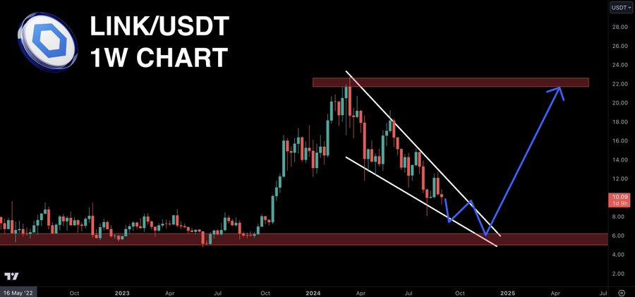 Em sua análise, Jack destacou duas condições principais que o LINK precisa cumprir para atingir US$ 22. De acordo com os analistas, a cunha descendente do LINK deve permanecer acima do nível de suporte de US$ 6.