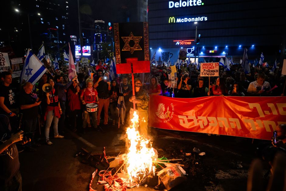 Na cidade costeira de Cesareia, os manifestantes contornaram as barricadas policiais para marchar em direção à residência de Netanyahu, gritando: “Não há perdão para o anjo da destruição” e “não há perdão para os fracassos e o abandono”.