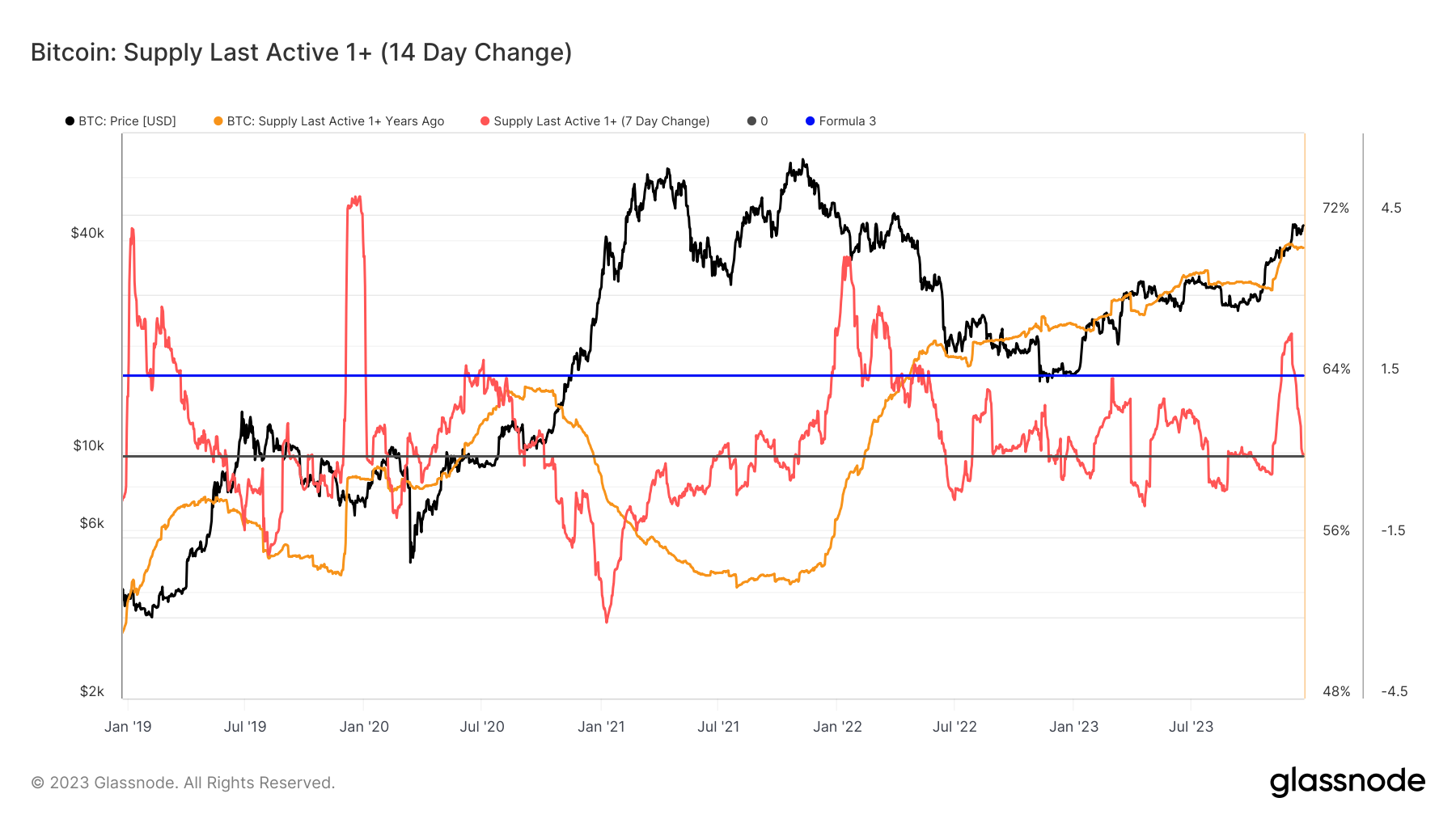 Gráfico mostrando o último fornecimento de Bitcoin ativo há mais de 1 ano, de dezembro de 2018 a dezembro de 2023 (Fonte: Glassnode)