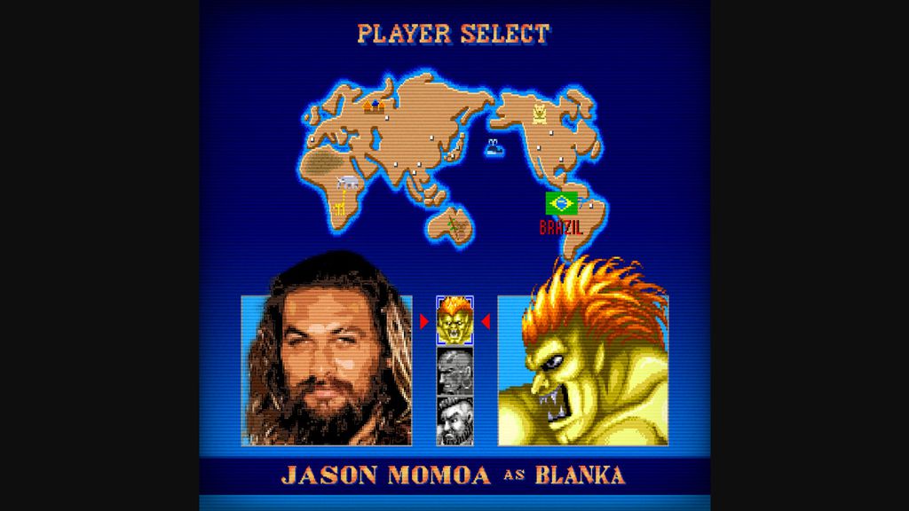 Um dos astros mais populares do filme de Street Fighter, Jason Momoa (Aquaman) interpreta o Blanka. Na franquia de videogame, Blanka é conhecido pela pele verde e os cabelos laranjas, sendo um lutador selvagem. Embora possa parecer uma escolha inusitada, o ator já é um velho conhecido das adaptações de games, pois estrelou Um Filme Minecraft (2025).