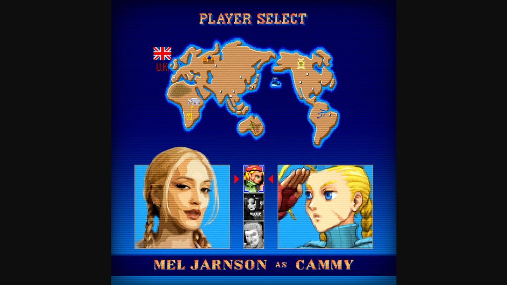 Mel Jarnson (Mortal Kombat) foi escalada em Street Fighter como Cammy, uma das lutadoras mais ágeis da franquia. A personagem é uma agente britânica do Delta Red e ex-assassina associada ao Shadaloo. Ela possui um estilo de luta rápida com os pés e uma notável cicatriz no rosto.
