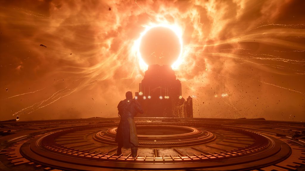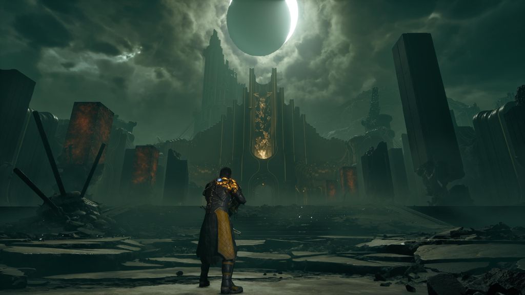 Os cenários gerados proceduralmente em Saros são bem agradáveis e bonitos, nada extraordinário, mas há alguns takes dignos de captura. Eles são acompanhados pelo símbolo do eclipse amarelo que vemos em todo o decorrer do jogo, seja olhando para o céu ou simbolicamente em devaneios de Arjun.