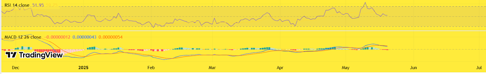 Shib permanece em uma estrutura de baixa, negociando abaixo dos principais EMAs, com US $ 0,00001450 atuando como um nível de fazer ou quebrar. Se esse suporte for mantido, é possível um salto de curto prazo para US $ 0,00001589 a US $ 0,00001700.
