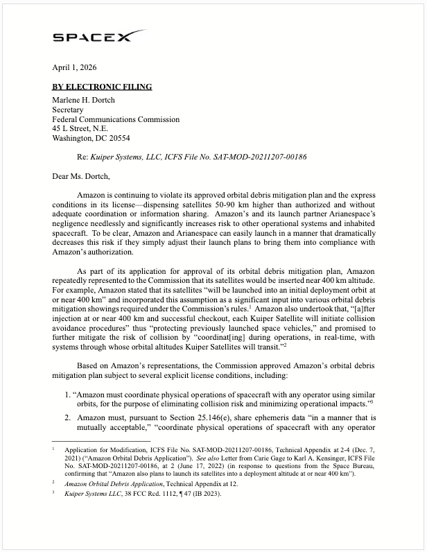 Segundo a SpaceX, a Amazon havia prometido à FCC que a inserção de seus satélites ocorreria em uma altitude próxima dos 400 km, mas os posicionou acima dos 450 km, justamente na faixa onde a Starlink está operando para baixar a altitude de sua própria frota.