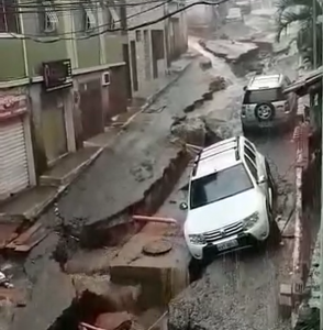 Uma rua no bairro Morro São Jorge, em Macaé, no estado do Rio de Janeiro, foi destruída por uma grande fenda que se abriu após um temporal nesta terça-feira (20).