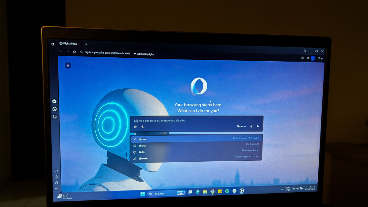 O Neon concentra todos os recursos dos navegadores da Opera e tem um painel lateral de IA integrado. Logo ao abrir uma nova aba, já é possível interagir com o chatbot e pedir para a inteligência artificial pesquisar ou desempenhar diferentes tarefas;