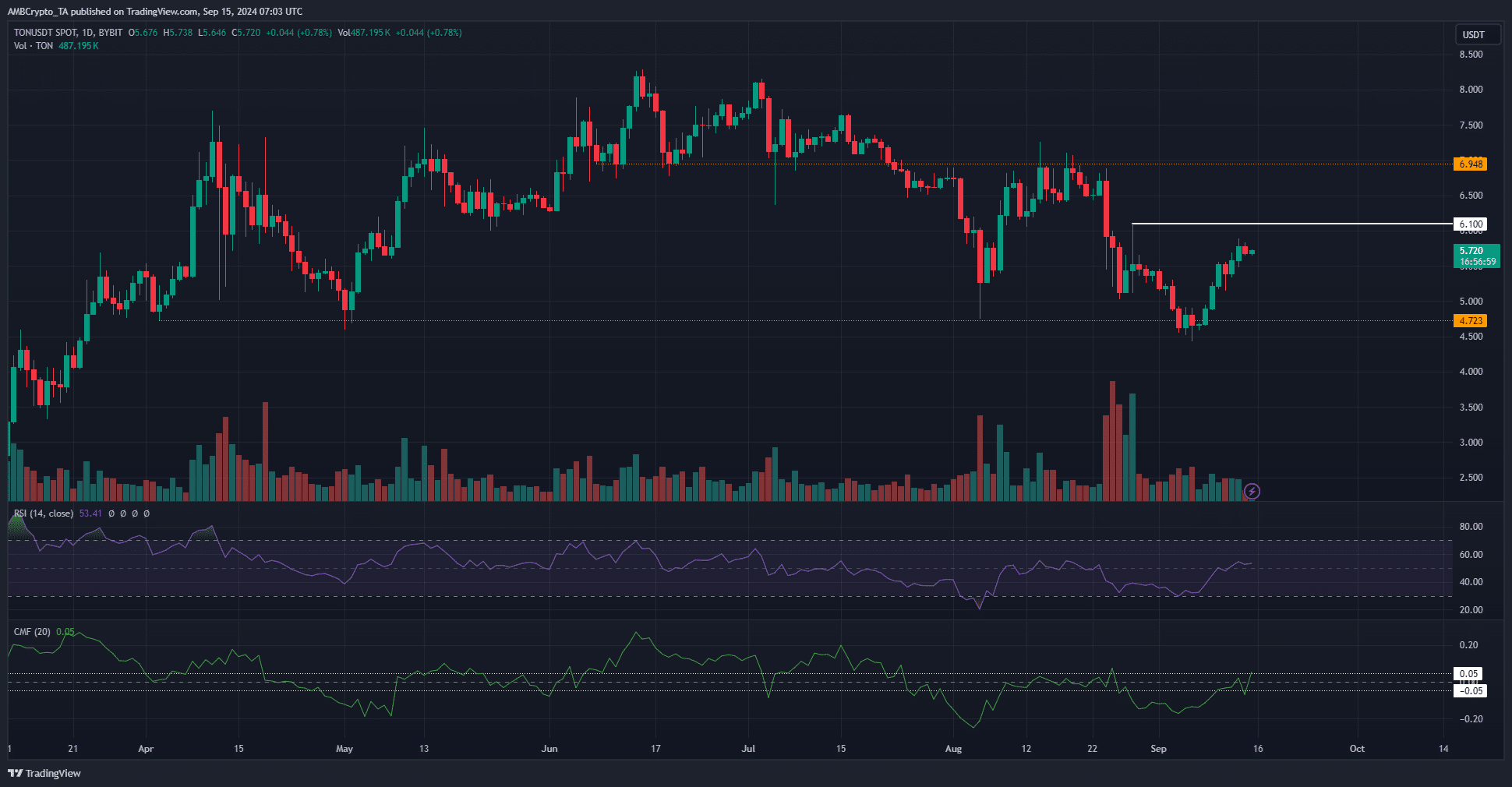 Moeda de Ton [TON] ganhou 32,84% em uma semana, da mínima de $ 4,43 na sexta-feira, 6 de setembro, para $ 5,885 na semana seguinte. Apesar destes ganhos fortes, a estrutura do mercado no período diário era de baixa.