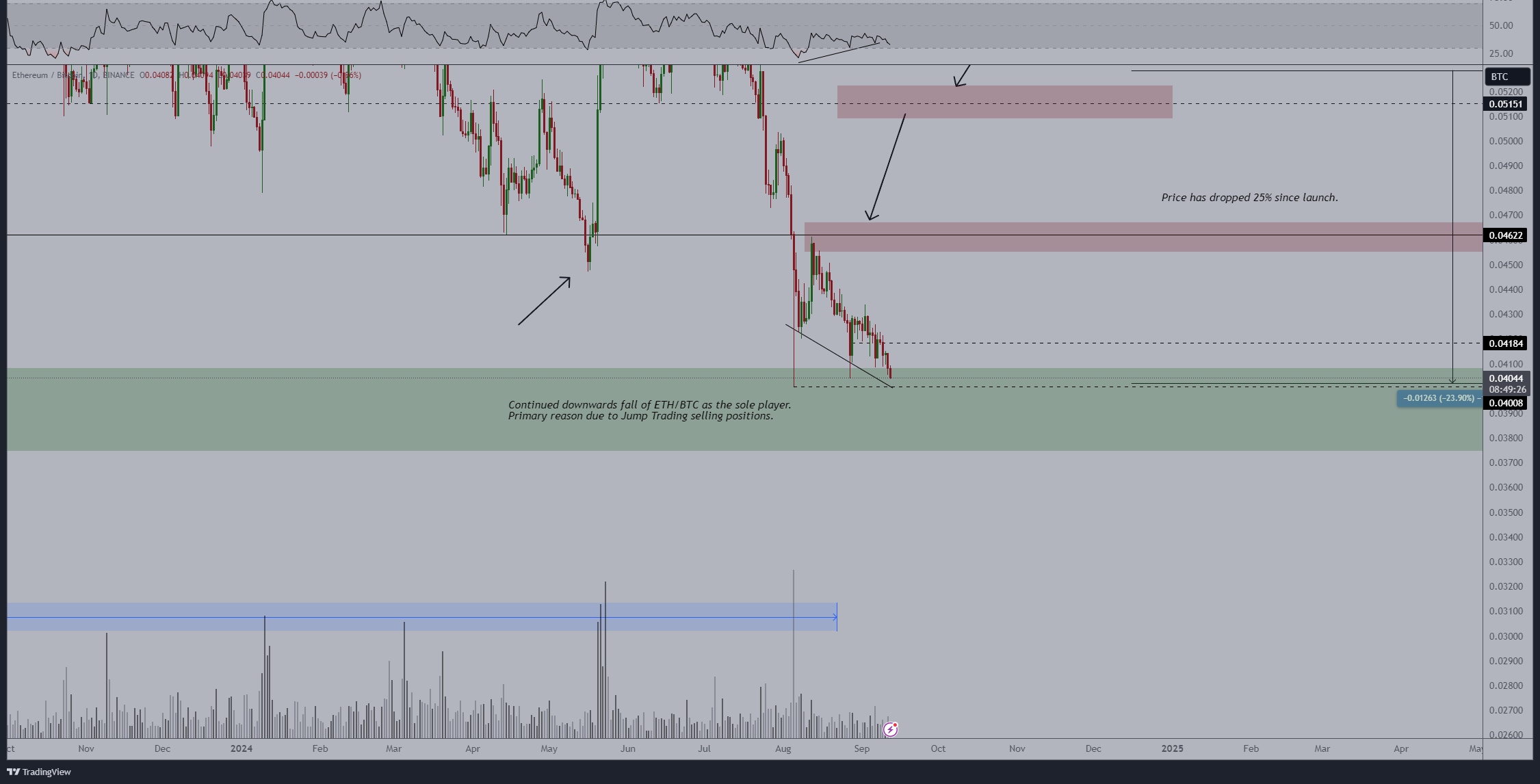 O Índice de Força Relativa (RSI) ETH/BTC destacou essa divergência, com a ação do preço caindo enquanto o RSI formou mínimas mais altas – um sinal de uma reversão potencial.