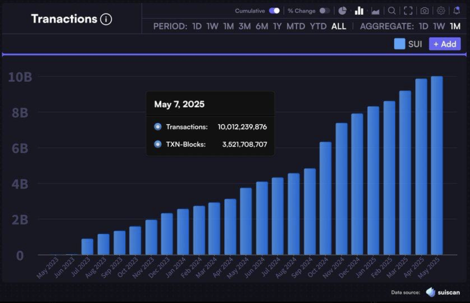 O volume de SUI está em ascensão desde o rebotes de setembro de 2024, que aumentou e marcou elevações acima de US $ 3,5 bilhões. Foi quando o preço marcou um novo Ath. Após um aperto notável de volume, o volume começou a subir novamente à medida que aumenta acima de US $ 1,5 bilhão. Por outro lado, a contagem de transações SOL também subiu e marcou níveis acima de 10 bilhões pela primeira vez na história.
