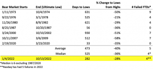 De uma perspectiva da Metodologia O’Neil, os mercados em alta começam com um Follow Thru Day (FTD) bem-sucedido, definido como um aumento nas médias do mercado de 1,7% ou mais em um volume maior do que no dia anterior. No entanto, em um mercado de baixa, esperamos que haja 4-5 FTDs falsos que subcutam sua baixa anterior estabelecida antes que o mercado finalmente atinja o fundo do poço. Conforme mostrado nas tabelas abaixo, este mercado de urso teve um número típico de FTDs fracassados e os comícios de urso falsificados estiveram aproximadamente em linha com a história, em média.