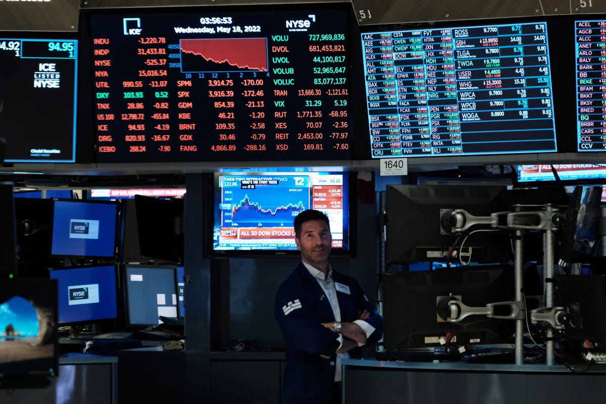 Trader da NYSE em 18 de maio. O Dow Jones Industrial Average caiu mais de 1000 pontos à medida que os mercados continuam … [+]
