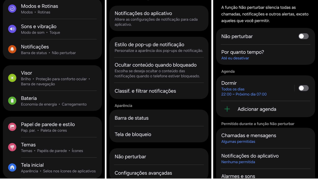 O modo “Não Perturbe” é ideal para momentos em que você precisa de foco total ou descanso. Ele bloqueia chamadas, mensagens e notificações, evitando distrações constantes ao longo do dia. Ao acessar as “configurações”, vá até as “notificações” e “não perturbe” para definir horários automáticos ou ative manualmente.