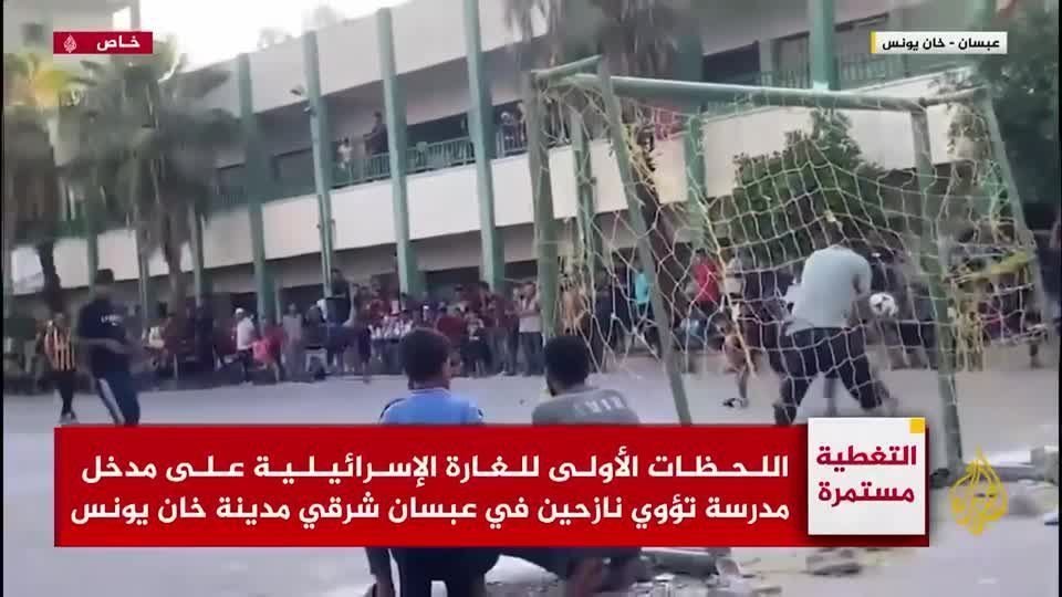 Um vídeo transmitido pela Al Jazeera mostra o momento em que um ataque aéreo israelense atingiu uma escola usada como abrigo para palestinos deslocados em Gaza, na terça-feira (9), a leste de Khan Younis.