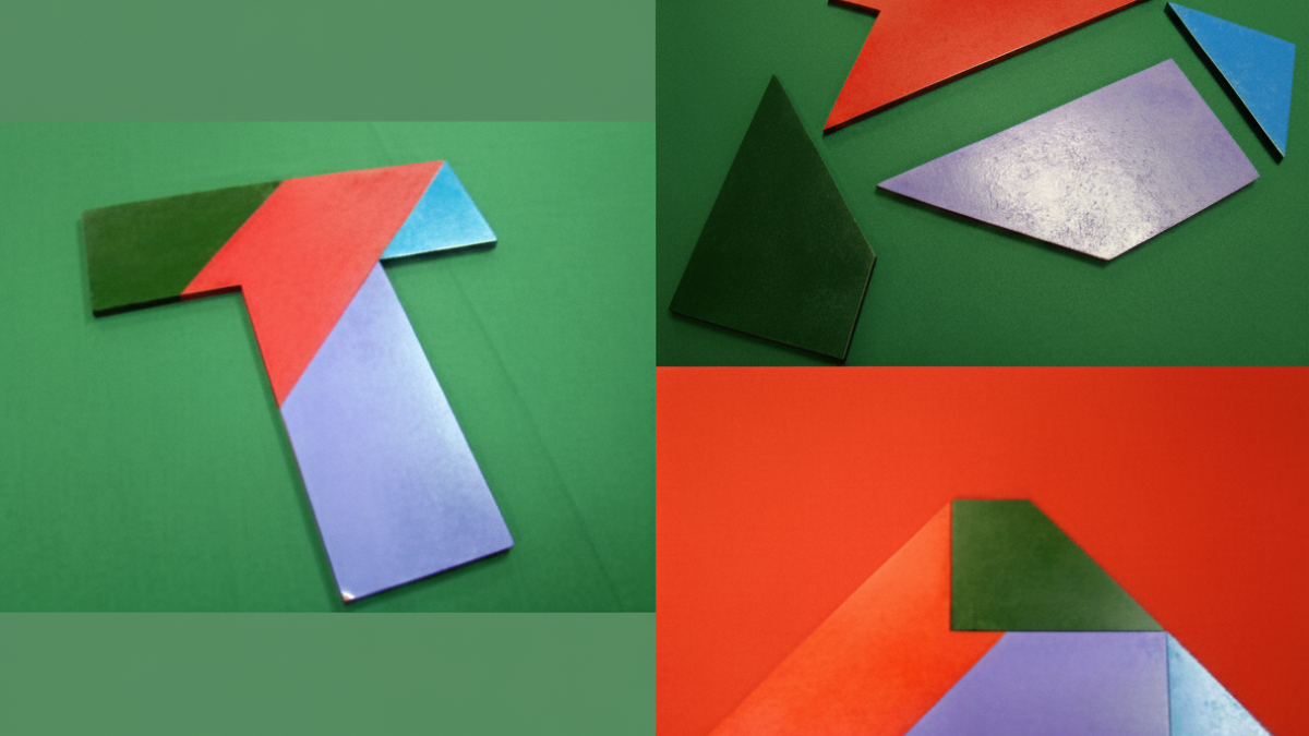 O objetivo é reorganizar quatro peças geométricas para formar a letra T perfeita.
