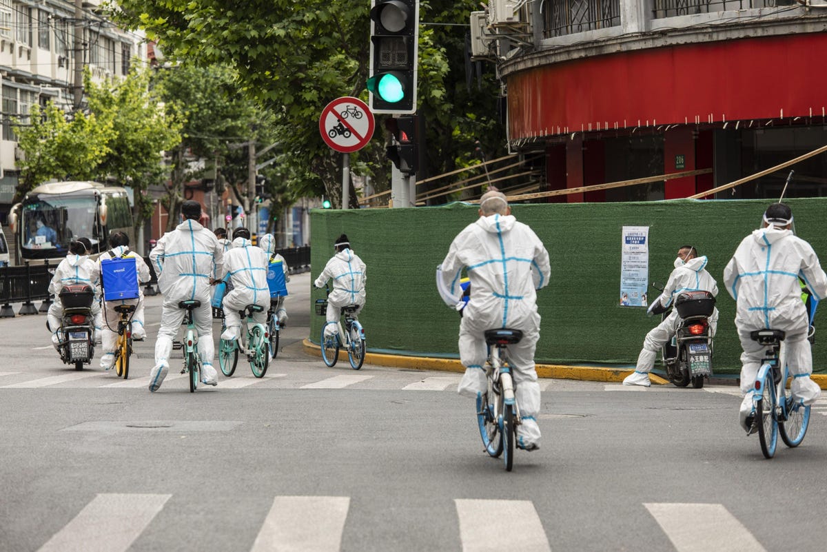 Membros de uma equipe de desinfecção andam de bicicleta por uma rua em Xangai, na China, no sábado, 7 de maio. … [+]